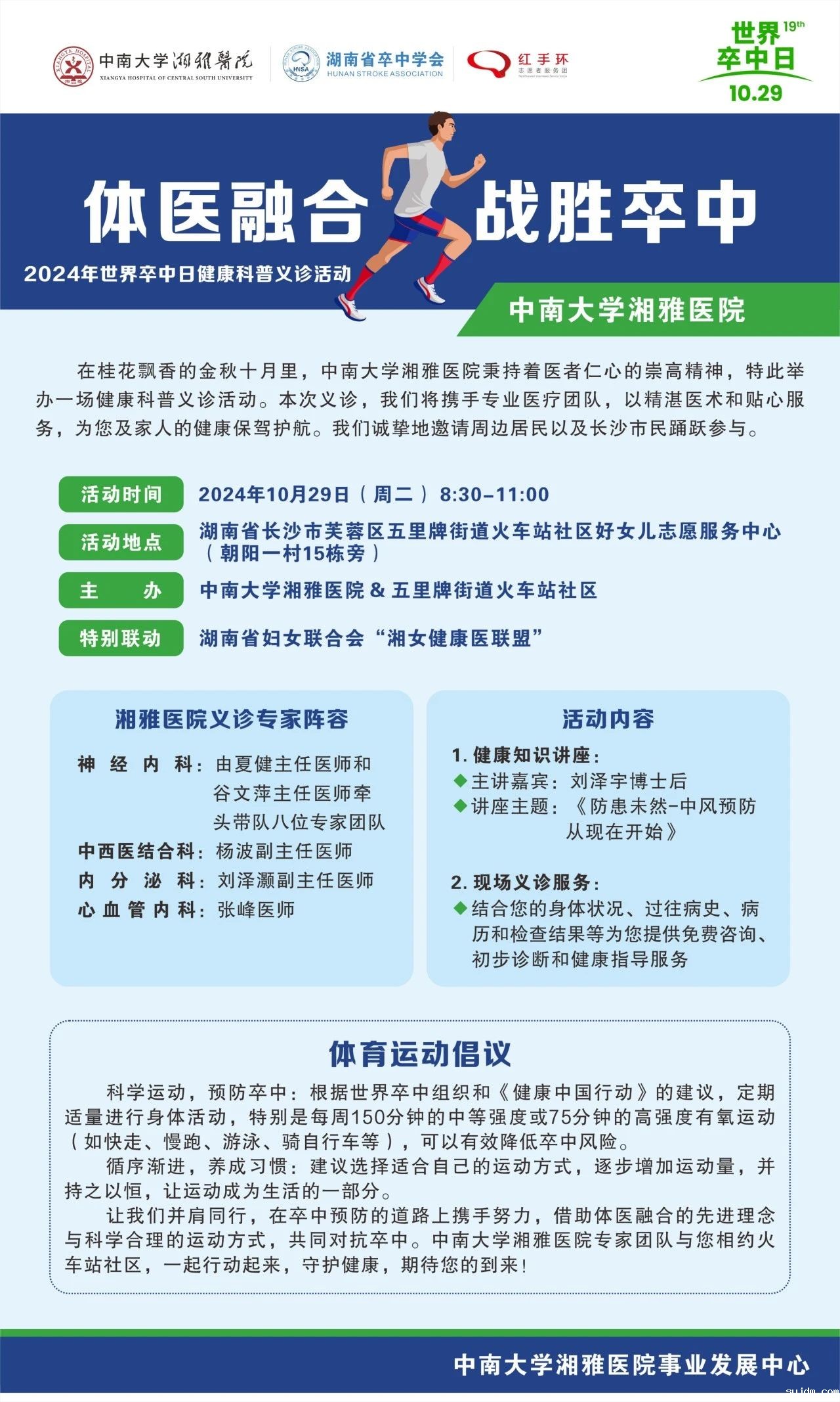 第19个世界卒中日2024/10/ 29为进一步普及卒中防治知识,降低社会卒中负担,倡导体医融合的健康理念,中南大学湘雅医院神经内科携手中西医结合科、内分泌科以及心血管内科,以精湛医术和贴心服务,为您及家人的健康保驾护航。“体医融合,战胜卒中”健康科普义诊活动 10月29日(周二) 8:30 芙蓉区五里牌街道火车站社区义诊、咨询、健康知识讲座…