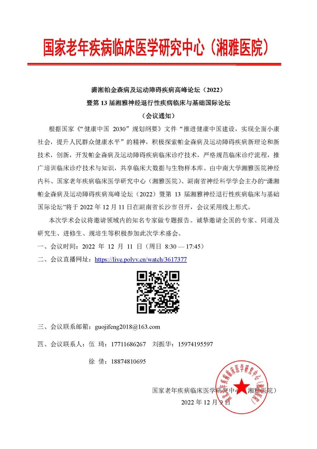 潇湘帕金森病及运动障碍疾病高峰论坛(2022)暨第13届湘雅神经退行性疾病临床与基础国际论坛(会议通知)根据国家《“健康中国 2030”规划纲要》文件“推进健康中国建设,实现全面小康社会,提升人民群众健康水平”的精神,积极探索帕金森病及运动障碍疾病新理论和新技术,创新,开发帕金森病及运动障碍疾病临床诊疗技术,严格规范临床诊疗流程,推广培训临床诊疗技术与知识,共享临床大数据与生物样本库。由中南大学湘雅医院神...