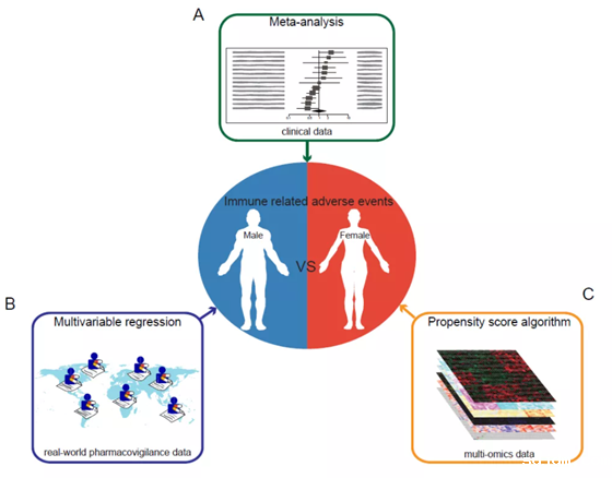 利用多模态多来源数据研究irAE性别差异的示意图