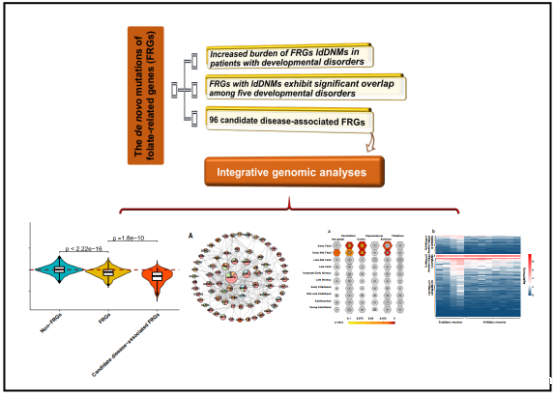 该团队题为“De novo mutations in folate-related genes associated with common developmental disorders”的原创性论著,基于课题组建立的跨组学分析体系从新发突变、候选基因、人脑时空表达特征、调控网络等多个角度阐述了叶酸相关基因新发突变在神经发育性疾病的重要作用,为部分患者通过补充叶酸改善临床表型提供了分子依据。已有研究表明:叶酸不足是多种发育障碍性疾病(孤独症、智力障碍、癫痫脑病、发育迟缓、先天性心脏病等)的风险因素之一;但是,叶酸相关基因在相关发育障碍性疾病中的遗传机制尚不清楚。该团队利用统计学模型(TADA)筛选发育障碍性疾病相关的叶酸相关基因(FRGs)和核心基因,系统地分析了FRGs的新发突变数据,并根据基因突变不耐受评分、蛋白质相互作用网络和表达模式研究这些基因在大脑中的时空表达特征。该研究发现,FRGs携带有害的新发突变在发育障碍性疾病患者中显著富集;通过TADA模型筛选96个与疾病相关的FRGs,在胚胎发育期间的兴奋性神经元中,以及在皮层、小脑、纹状体中显著高表达。该研究从遗传学角度解读了叶酸相关基因的新发突变在发育障碍性疾病的重要作用和调控机制,为遗传咨询和临床诊断提供了详实的遗传学证据。罗腾飞博士研究生和李阔阔博士为该论文的并列第一作者,李津臣教授、夏昆教授和潘乾教授为共同通讯作者。