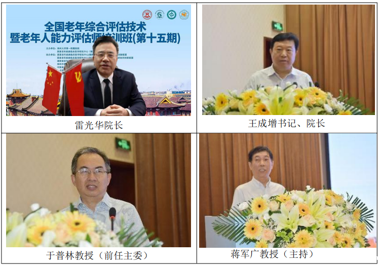 中华医学会老年医学分会第九届主任委员、北京医院于普林教授,中南大学湘雅医院院长、国家老年疾病临床医学研究中心(湘雅医院)主任雷光华教授,郑州大学第一附属医院书记、院长王成增教授,河南省老干部康复医院(河南省老年医院)党委书记杨惠芳教授,郑州市第九人民医院(郑州市老年医院)副院长黄伟教授,国家老年疾病临床医学研究中心(湘雅医院)常务副主任陈琼教授及中心办公室任旭芝主任、中心老年综合评估与管理中心石柯教授等领导和专家出席了开班仪式。开班仪式由郑州大学第一附属医院老年医学部主任蒋军广教授主持。