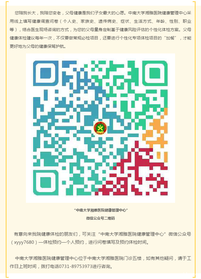 给父母做健康体检,体检项目的选择应遵循“1+X”的原则。“1”为常规必查的体检项目,“X”为个性化的专项体检项目。具体该怎么选呢?下面湘雅专家给大家来说说。