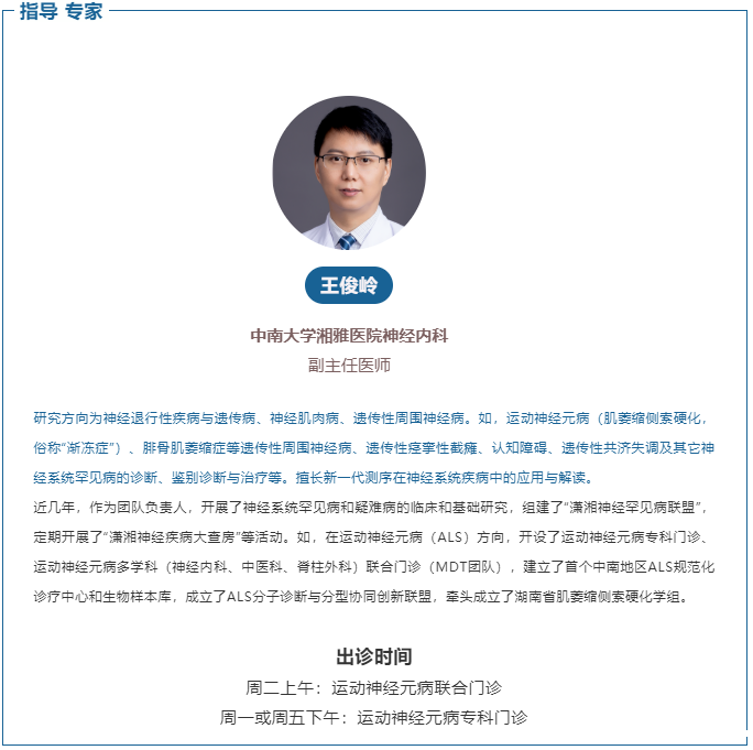 家族性ALS可以呈现常染色体显性遗传、常染色体隐性遗传、X连锁等遗传方式。对于有ALS家族史的患者,或者家族史不明确但是发病年龄比较年轻的患者,我们建议进行基因检测以明确相应的致病基因。