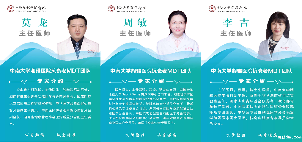 近年来,以中南大学湘雅医院心血管内科莫龙教授牵头,联合内分泌科、皮肤科、妇科、老年科、中医科、健康管理中心和护理等多个学科的专家教授特开设了全国首个抗衰老MDT门诊,旨在通过专业诊疗护理团队的健康管理,达到延缓生理性衰老,干预病理性衰老,改善功能性衰老的目标,具体挂号和看诊流程附后。