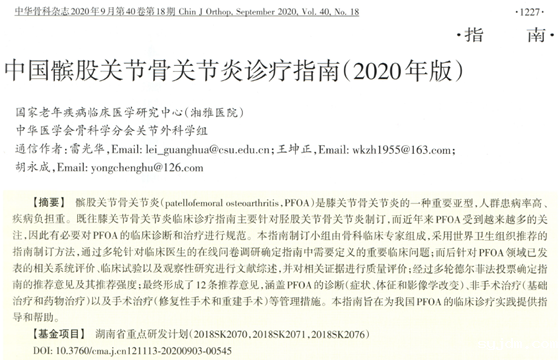 近日,由国家老年疾病临床医学研究中心(湘雅医院)和中华医学会骨科学分会关节外科学组发起制订的《中国髌股关节骨关节炎诊疗指南(2020年版)》在《中华骨科杂志》2020年第40卷第18期正式发布,中南大学湘雅医院骨科雷光华教授、西安交通大学第二附属医院王坤正教授和天津医院胡永成教授为该指南的共同通讯作者,中南大学湘雅医院骨科曾超特聘教授和西安交通大学第二附属医院杨佩副教授为共同执笔,中南大学湘雅医院骨科胡懿郃教授、肖文峰副教授、高曙光副教授、李宇晟副研究员、熊依林主治医师等31位国内关节外科领域知名专家参与了该指南的制订。