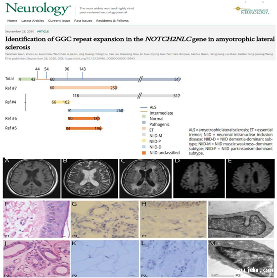 近日,中南大学湘雅医院神经内科、国家老年疾病临床医学研究中心(湘雅医院)老年神经退行性疾病研究所王俊岭副教授、唐北沙教授团队在探索肌萎缩侧索硬化(ALS)的遗传学因素研究中获得了重要进展,以“Identification of GGC repeat expansion in the NOTCH2NLC gene in amyotrophic lateral sclerosis”为题,在国际临床神经病学顶尖期刊、美国神经病学学会官方期刊《Neurology》(IF=8.77)以原创论著形式发表。神经内科博士生袁艳春为论文第一作者,王俊岭副教授为论文独立通讯作者,唐北沙教授为论文共同作者,湘雅医院为第一单位和通讯单位。该研究首次在ALS患者中筛查并发现了NOTCH2NLC基因的GGC重复扩增,报道了携带该重复突变患者的特殊临床表型。