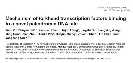 国家老年疾病临床医学研究中心(湘雅医院)核心PI陈永恒教授课题组采用生物化学、分子生物学、生物信息学和结构生物学方法,研究发现了一类全新的forkhead蛋白结合位点,阐明了forkhead家族蛋白结合DNA位点的分子机制,并以“Mechanism of Forkhead Transcription Factors Binding to a Novel Palindromic DNA Site”为题在国际权威期刊Nucleic Acids Research(影响因子IF:11.5,即时IF:15.7,科睿唯安和中科院分区均为一区)发表原创性论著,其第一作者和第一通讯作者单位均为中南大学湘雅医院,李俊博士后和代书炎博士后为共同第一作者,陈永恒教授为通讯作者。上海同步辐射光源(SSRF)BL17U1/ BL19U1为本研究提供了重要的技术支持。