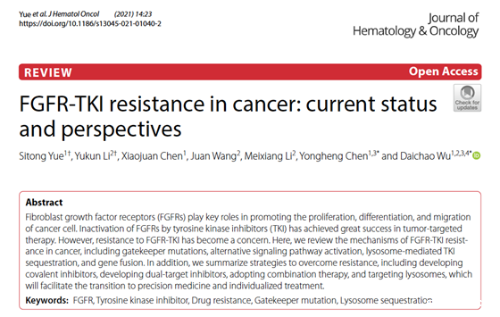 近日,中南大学湘雅医院国家卫健委肿瘤蛋白质组学重点实验室、国家老年疾病临床医学研究中心(湘雅医院)核心PI陈永恒教授课题组与南华大学伍代朝博士合作,在国际权威期刊Journal of Hematology & Oncology上发表题为“ FGFR-TKI resistance in cancer: current status and perspectives”的综述。陈永恒教授和伍代朝博士为该文的通讯作者,湘雅医院硕士研究生乐思彤为第一作者,南华大学博士研究生李昱堃为并列第一作者,中南大学湘雅医院为第一作者单位。