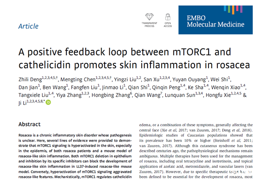 近日,中南大学湘雅医院皮肤科、衰老生物学湖南省重点实验室、国家老年疾病临床医学研究中心老年皮肤免疫疾病研究所李吉教授和谢红付教授课题组在《EMBO Molecular Medicine》 (《EMBO分子医学》杂志,5年IF:10.3,即时IF:11.3)上发表了题为“A positive feedback loop between mTORC1 and cathelicidin promotes skin inflammation in rosacea”(mTORC1-LL37正反馈调节环路促进玫瑰痤疮皮肤炎症发生)的原创性研究论文。