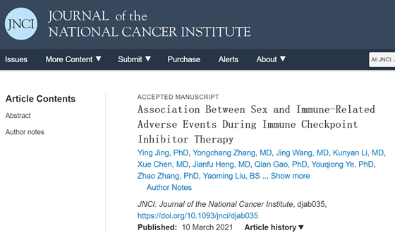 近日,中南大学湘雅医院皮肤科、国家老年疾病临床医学研究中心老年皮肤免疫疾病研究所、教育部重要皮肤疾病研究创新引智基地、皮肤肿瘤与银屑病湖南省重点实验室、中南大学湘雅个体化肿瘤免疫治疗临床研究中心陈翔教授和刘洪教授,在Journal of the National Cancer Institute(影响因子11.57)上发表题目为:Association between sex and immune-related adverse events during immune checkpoint inhibitor therapy(《癌症免疫治疗中免疫相关不良反应的性别差异》)的研究论文。