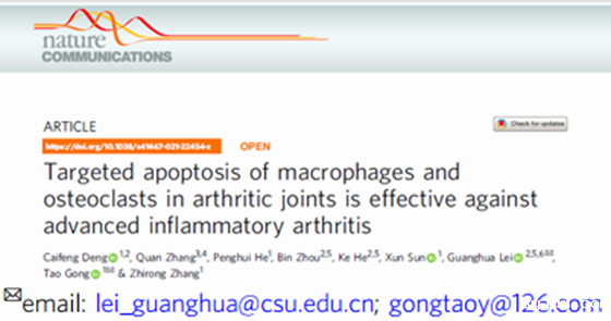 4月12日,中南大学湘雅医院骨科/国家老年疾病临床医学研究中心雷光华教授团队与四川大学华西药学院龚涛教授团队合作,在关节炎纳米靶向治疗研究领域取得的重要研究成果“Targeted apoptosis of macrophages and osteoclasts in arthritic joints is effective against advanced inflammatory arthritis”,在《Nature Communications 》(IF 12.121)以“Original Article”形式在线发表。中南大学湘雅医院骨科/骨关节退变与损伤湖南省重点实验室在站博士后邓彩凤为论文单独第一作者,雷光华教授和龚涛教授为论文共同通讯作者,骨关节退变与损伤湖南省重点实验室周彬和何可为论文共同作者。