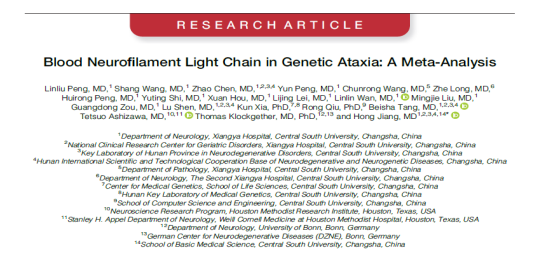 近日,中南大学湘雅医院神经内科/国家老年疾病临床医学研究中心江泓教授、唐北沙教授团队在关于遗传性共济失调的生物标志物研究中取得重要进展,以“Blood Neurofilament Light Chain in Genetic Ataxia: A Meta-Analysis”为题,在国际临床神经病学顶尖期刊《Movement Disorders》(IF=10.338)以原创论著形式发表。江泓教授为论文通讯作者,博士研究生彭林柳、王赏为论文第一作者,唐北沙教授为论文共同作者,湘雅医院为第一单位和通讯单位。